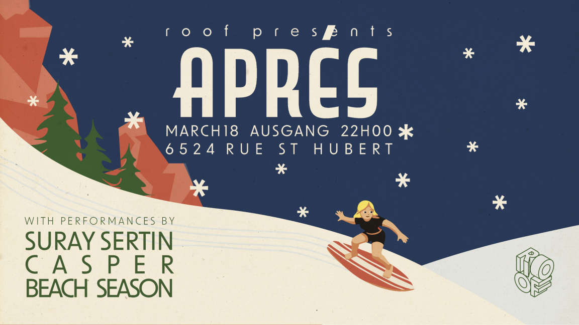 ROOF est un collectif d’artistes qui organise des événements pour des amis, par des amis. Ils vous présentent APRÈS, avec Suray Sertin, Casper et Beach season le 18 mars à Ausgang Plaza!